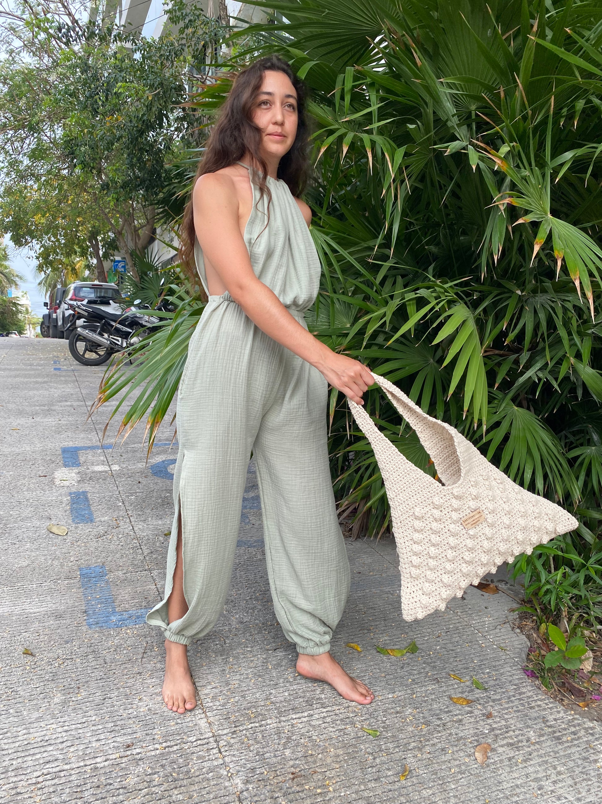 Bolsa triangular con chibolas tejidas a mano que le dan una estructura juguetona y elegante.